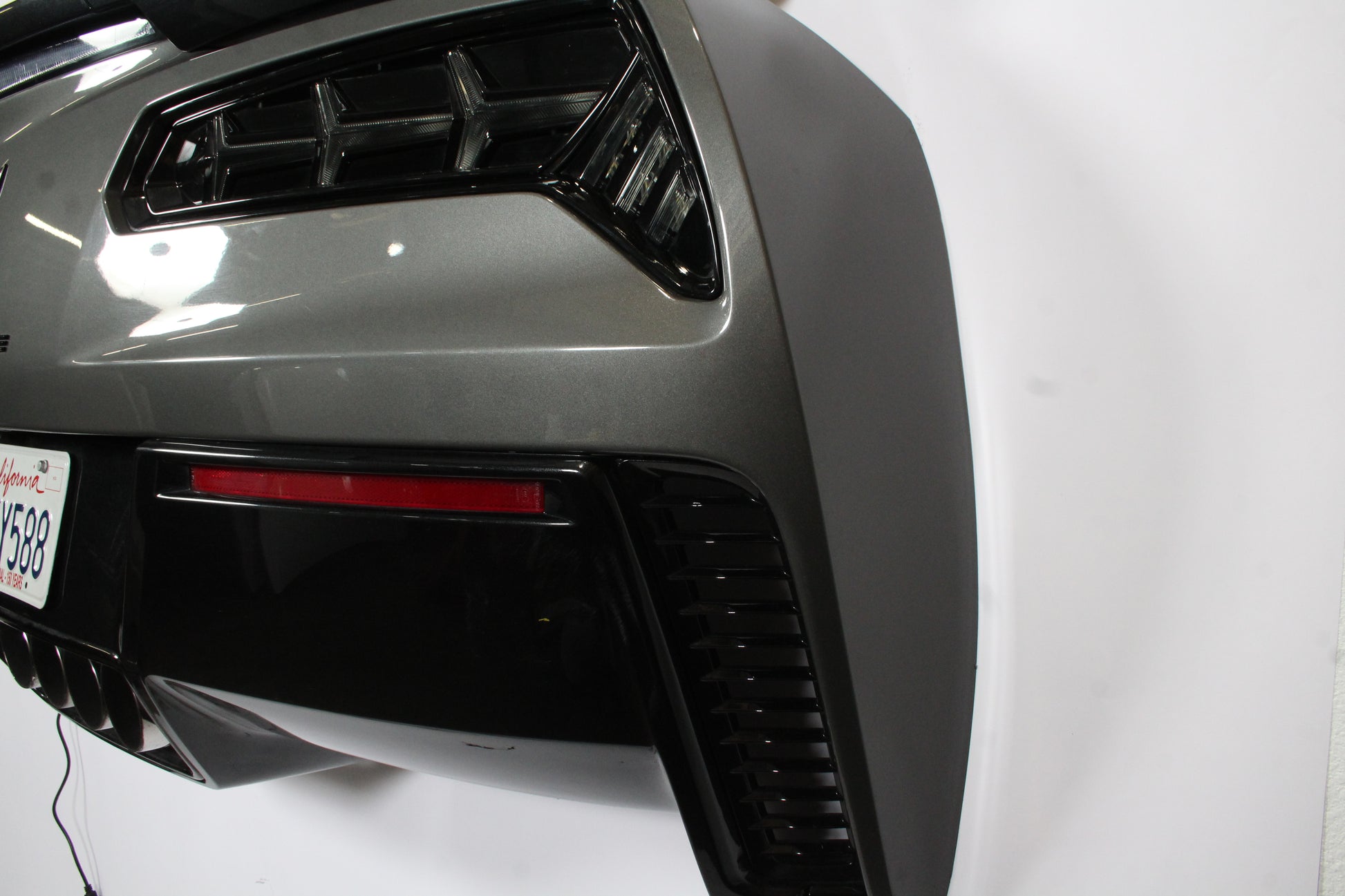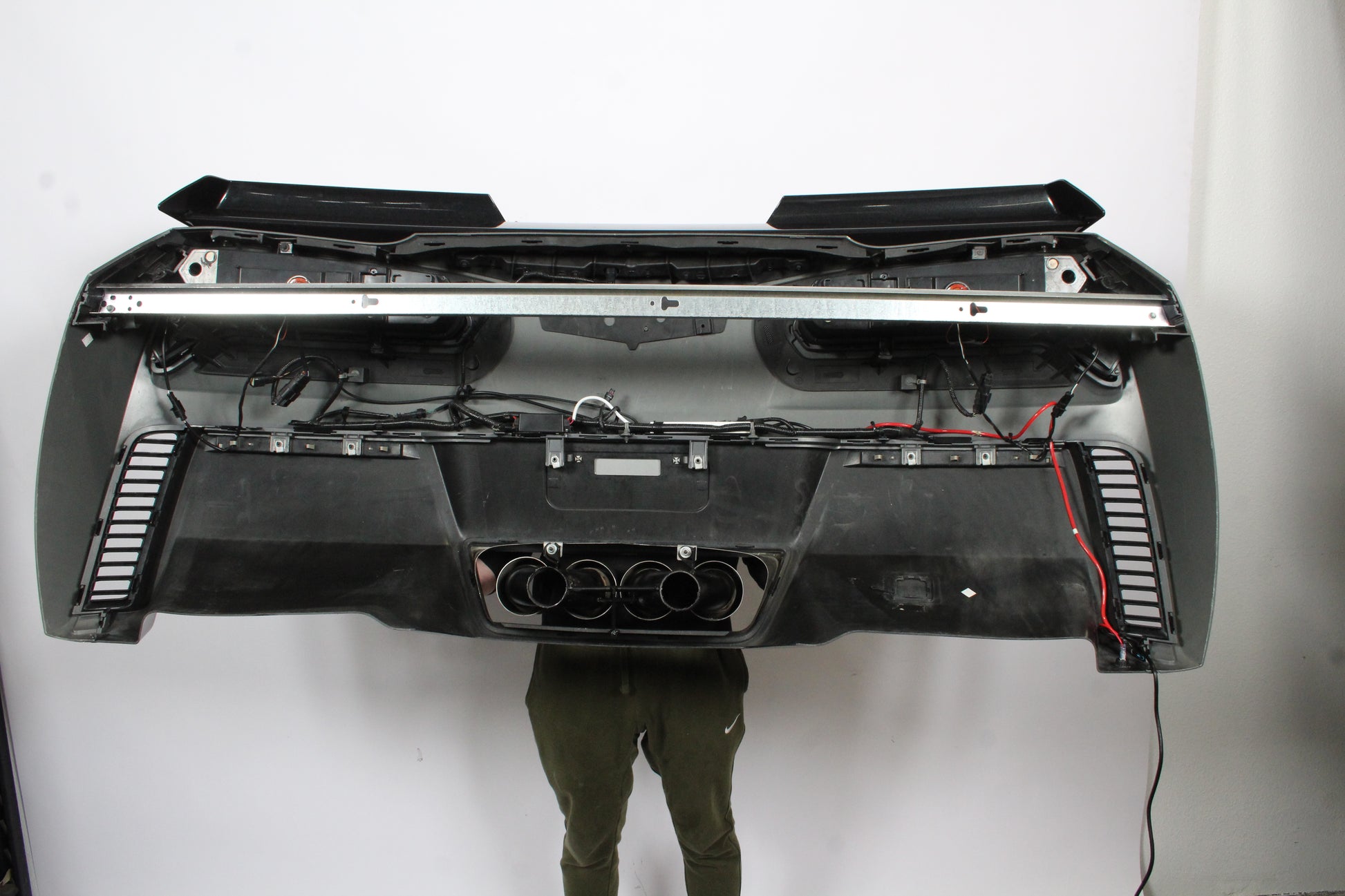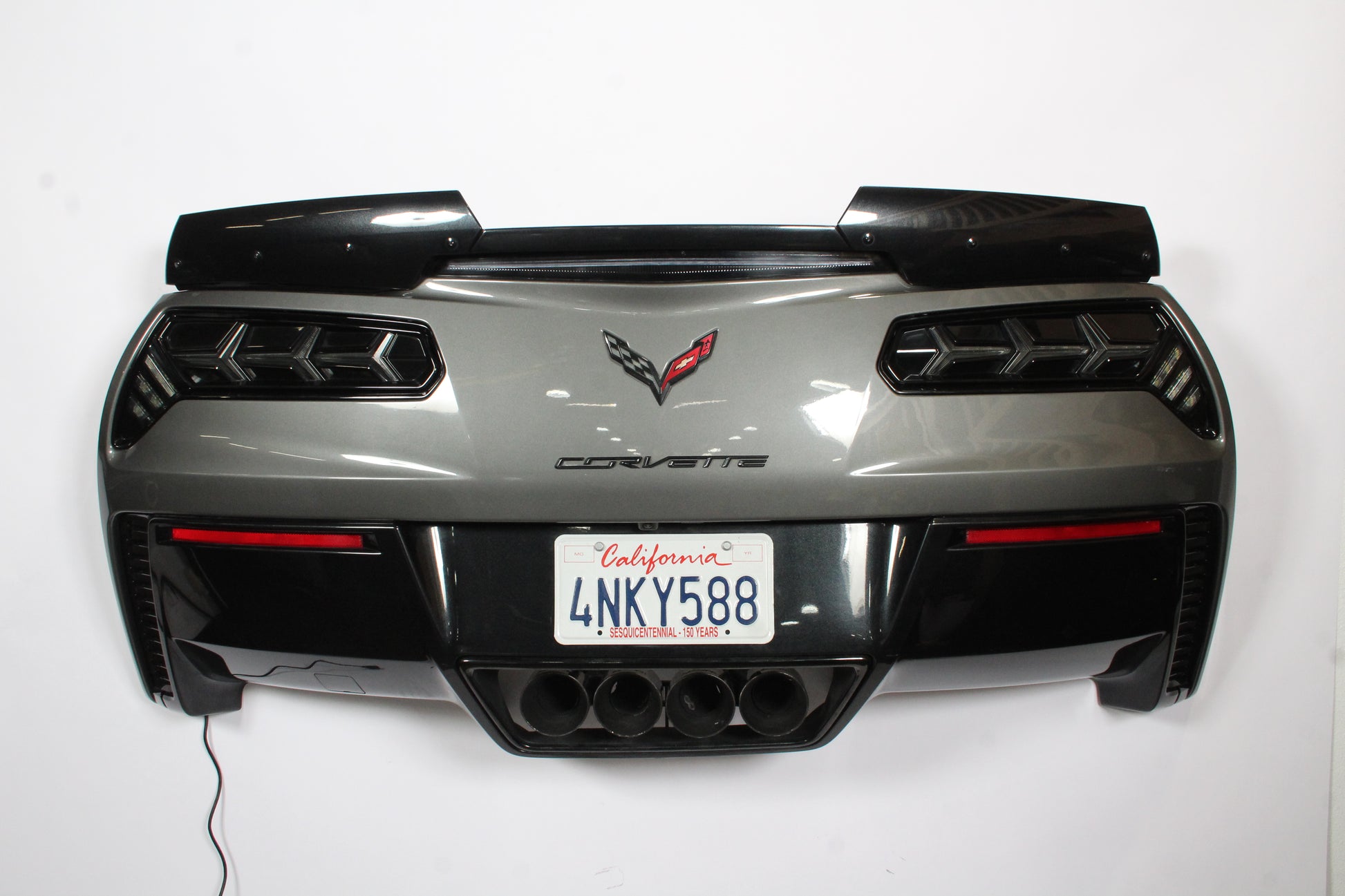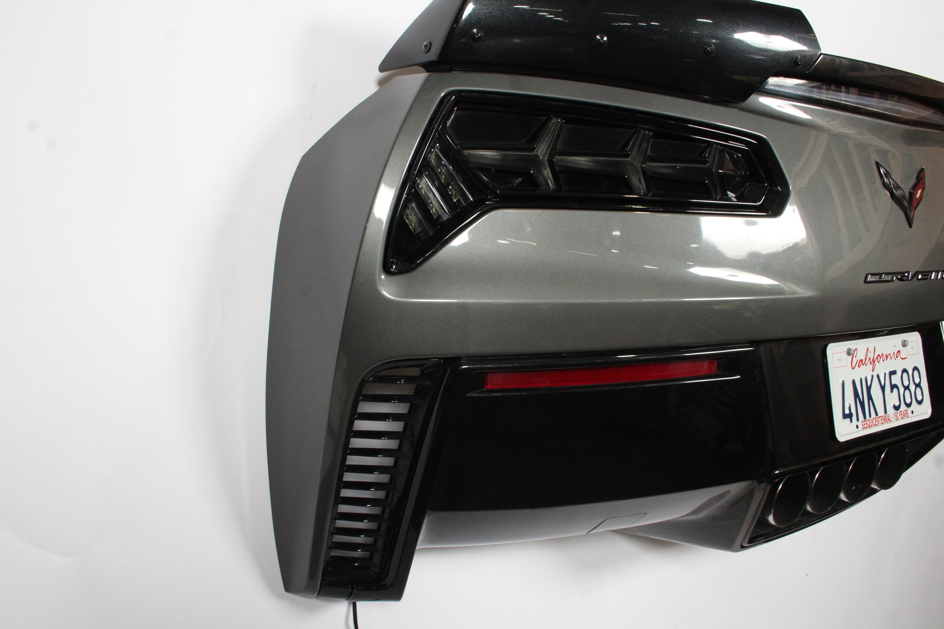 This wall art features a rear bumper cover, third brake light assembly, and exhaust outlets sourced from a C7-generation Chevrolet Corvette. The piece is finished in gray and equipped with remote-controlled aftermarket LED tail lights and incandescent license plate lights. An aluminum wall-mounting bracket supports the back of the piece.