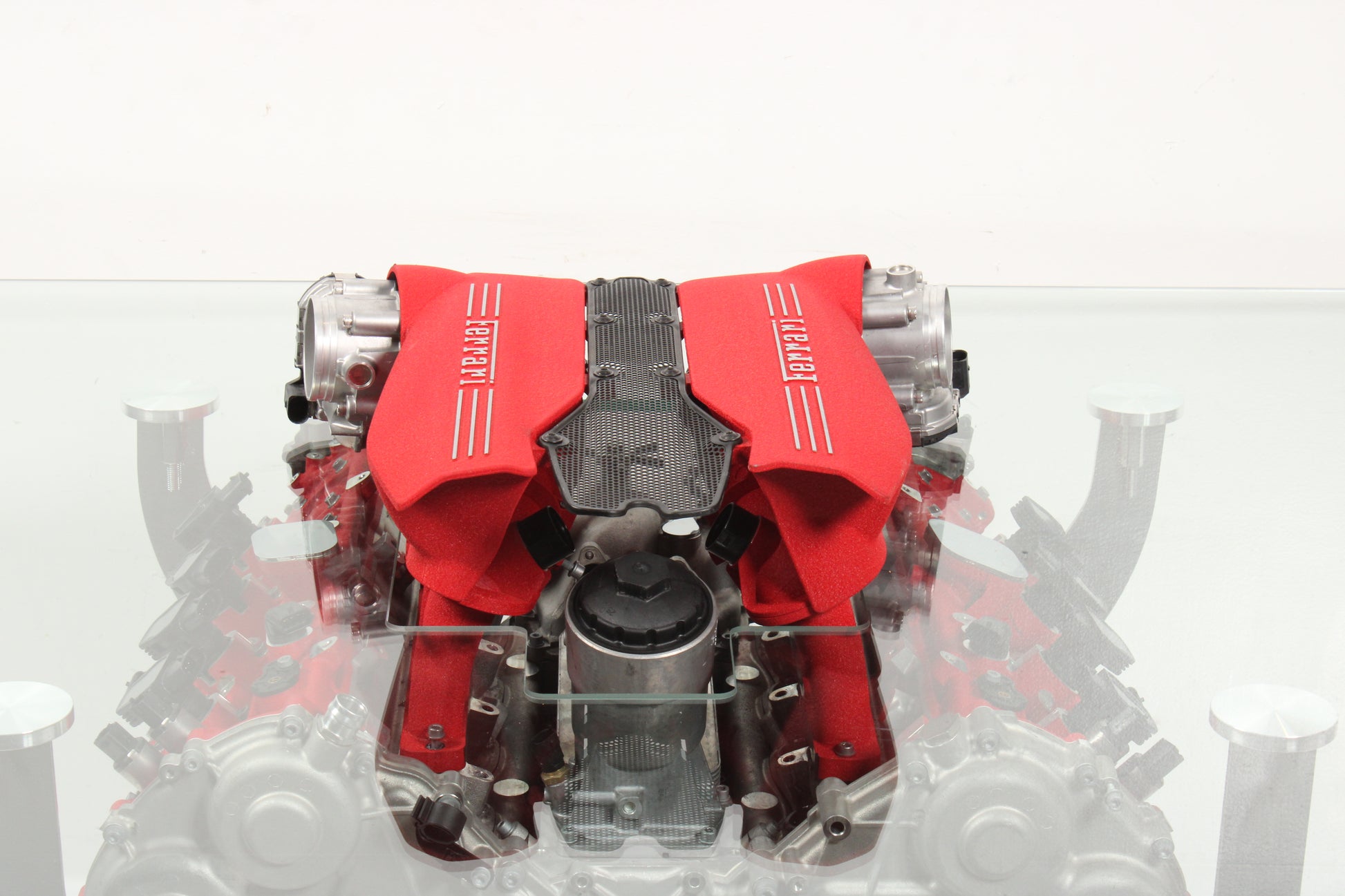 This engine coffee table consists using powertrain components that were sourced from a Ferrari 488. The partially-assembled engine wears a grey and red color scheme. Features include a tempered glass tabletop supported by four metal posts, an intake manifold that extends above the tabletop through cutouts in the surface, and lockable caster feet. The glass size is 58 x 46 inches with 1/2 thickness tempered glass.
