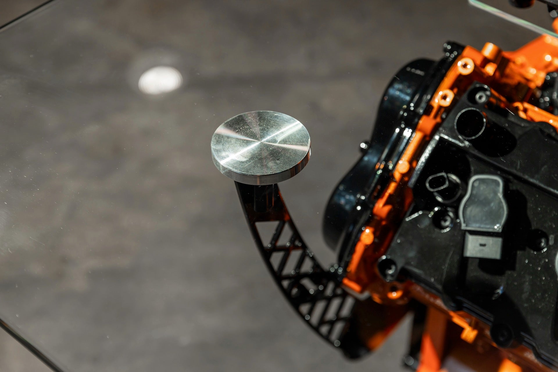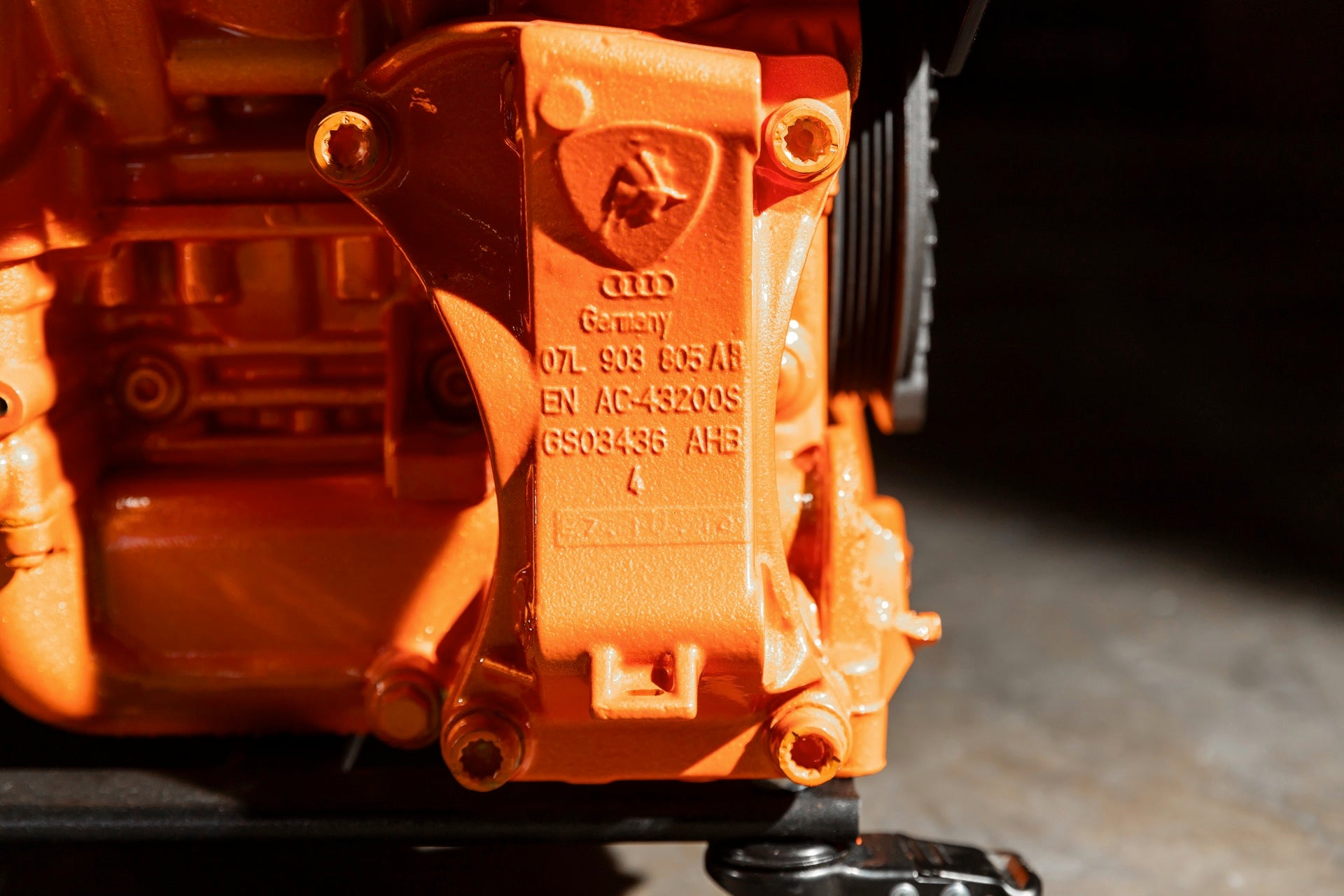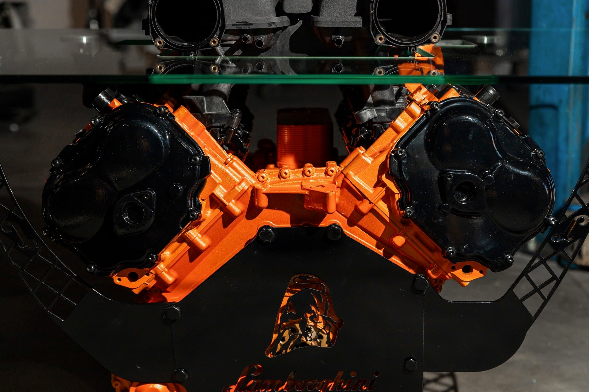 Constructed using components from a Lamborghini Huracán V-10 engine. Engine block, cylinder heads, and intake manifold are powder-coated in orange. Black intake plenum rises above a glass surround supported by custom-fabricated metal posts. Sits on six lockable casters and weighs around 250 lbs with dimmensions 54 in. x 44 in. x 33 in.