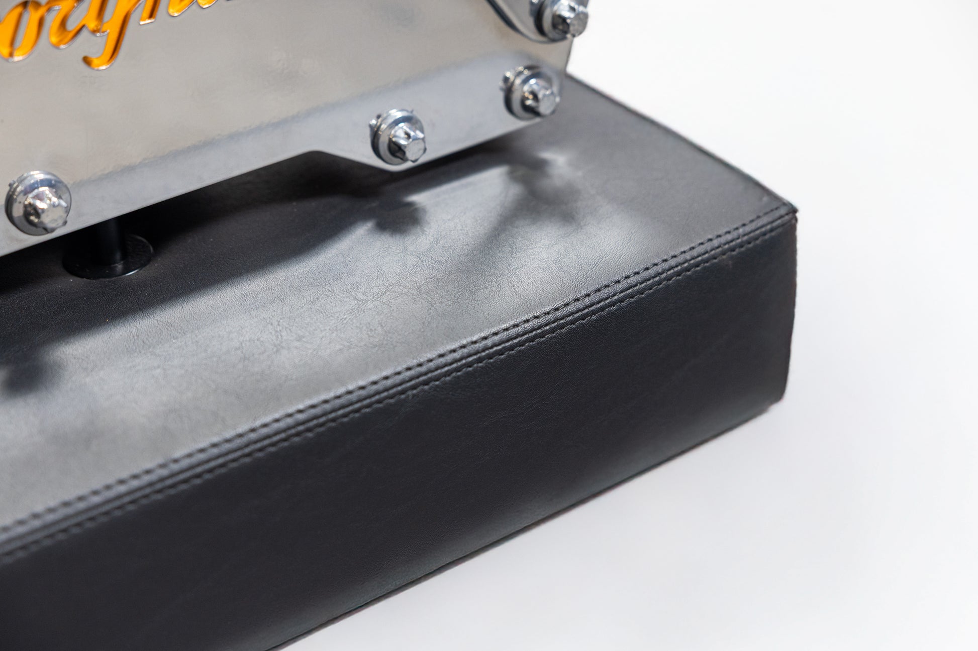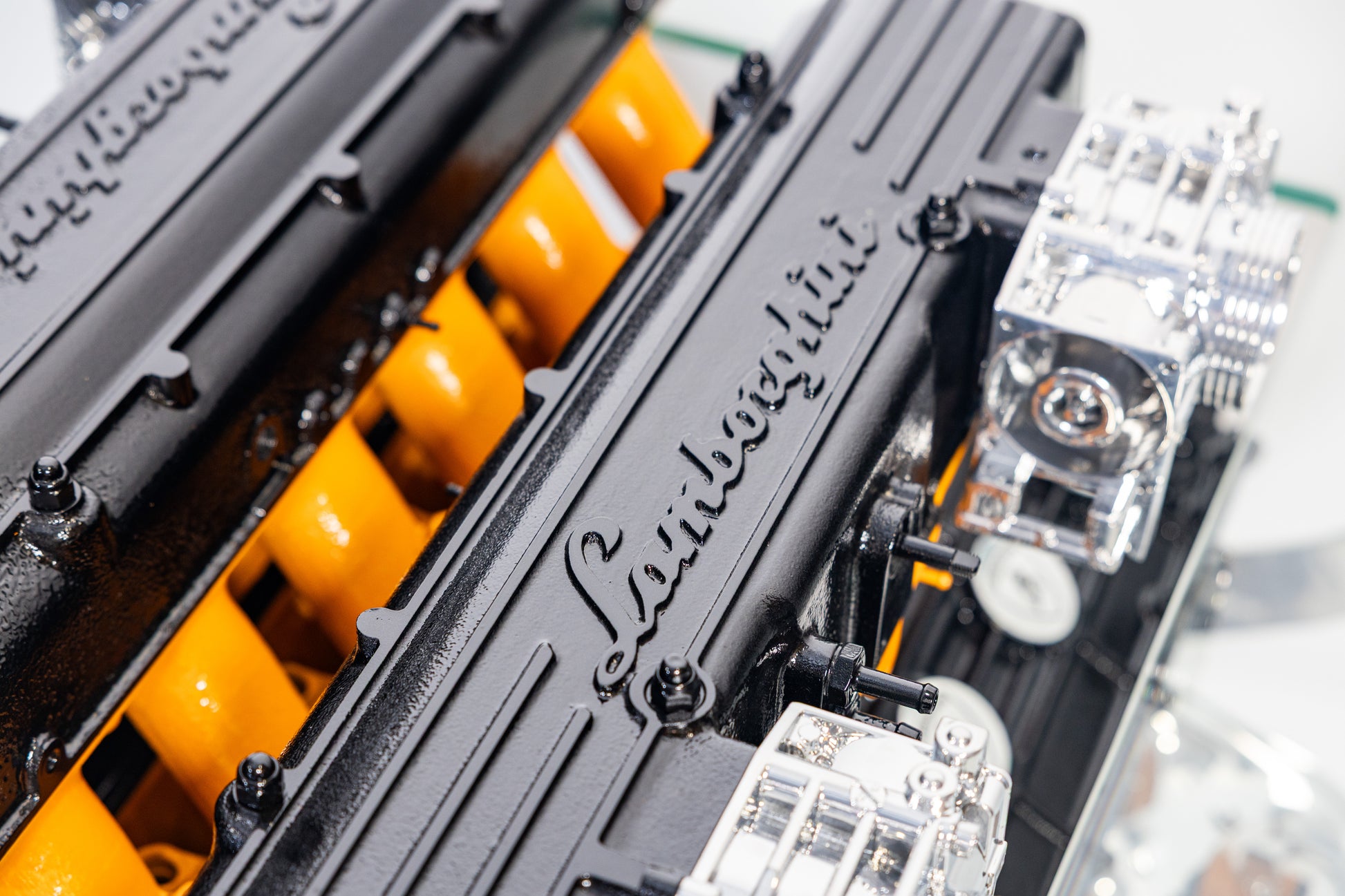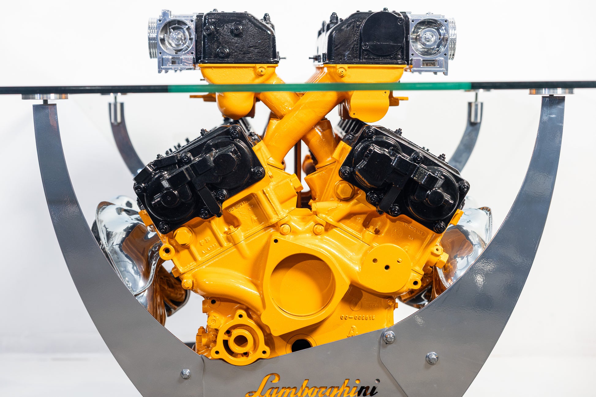 A Lamborghini Murcielago V12 Engine coffee table, authentic 6.2-liter V-12 engine from a Lamborghini Murcielago, artfully integrated as the centerpiece of this coffee table. Custom metal supports secure a half inch-thick tempered glass tabletop that measures 60"W x 55"L and displays the engine in all its mechanical glory, replete with a cutout for the shapely black and yellow intake plenums. Mounted on casters for ease of positioning and movement. The dimensions for the engine by itself are approximately 250 pounds, 33"H x 35"W x 45"L.